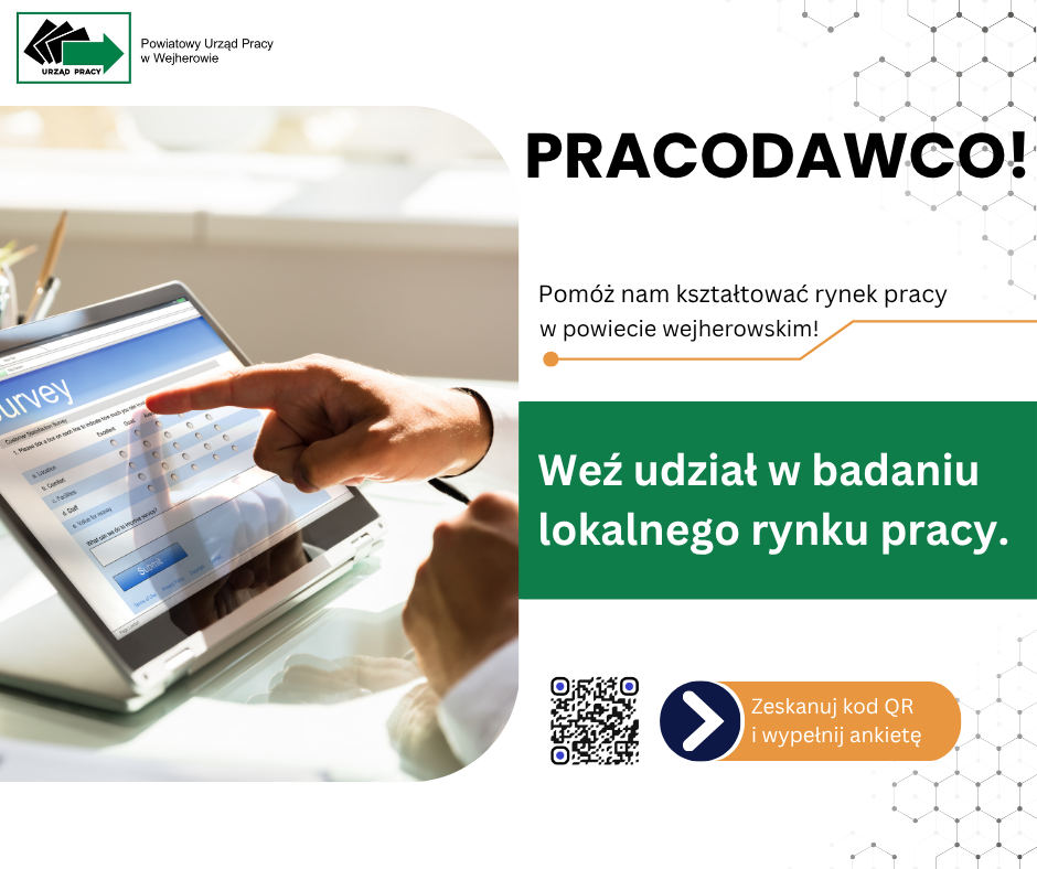 Powiatowy Urząd Pracy w Wejherowie prowadzi badanie dotyczące sytuacji na lokalnym rynku pracy. Celem ankiety jest poznanie aktualnych potrzeb i oczekiwań pracodawców, a także zebranie informacji, które pozwolą lepiej dopasować działania urzędu do realiów gospodarczych naszego powiatu.